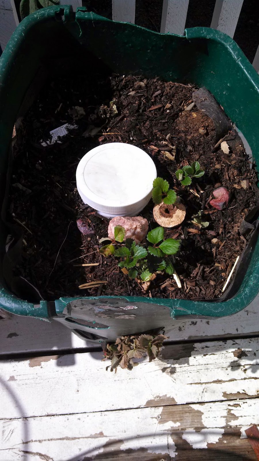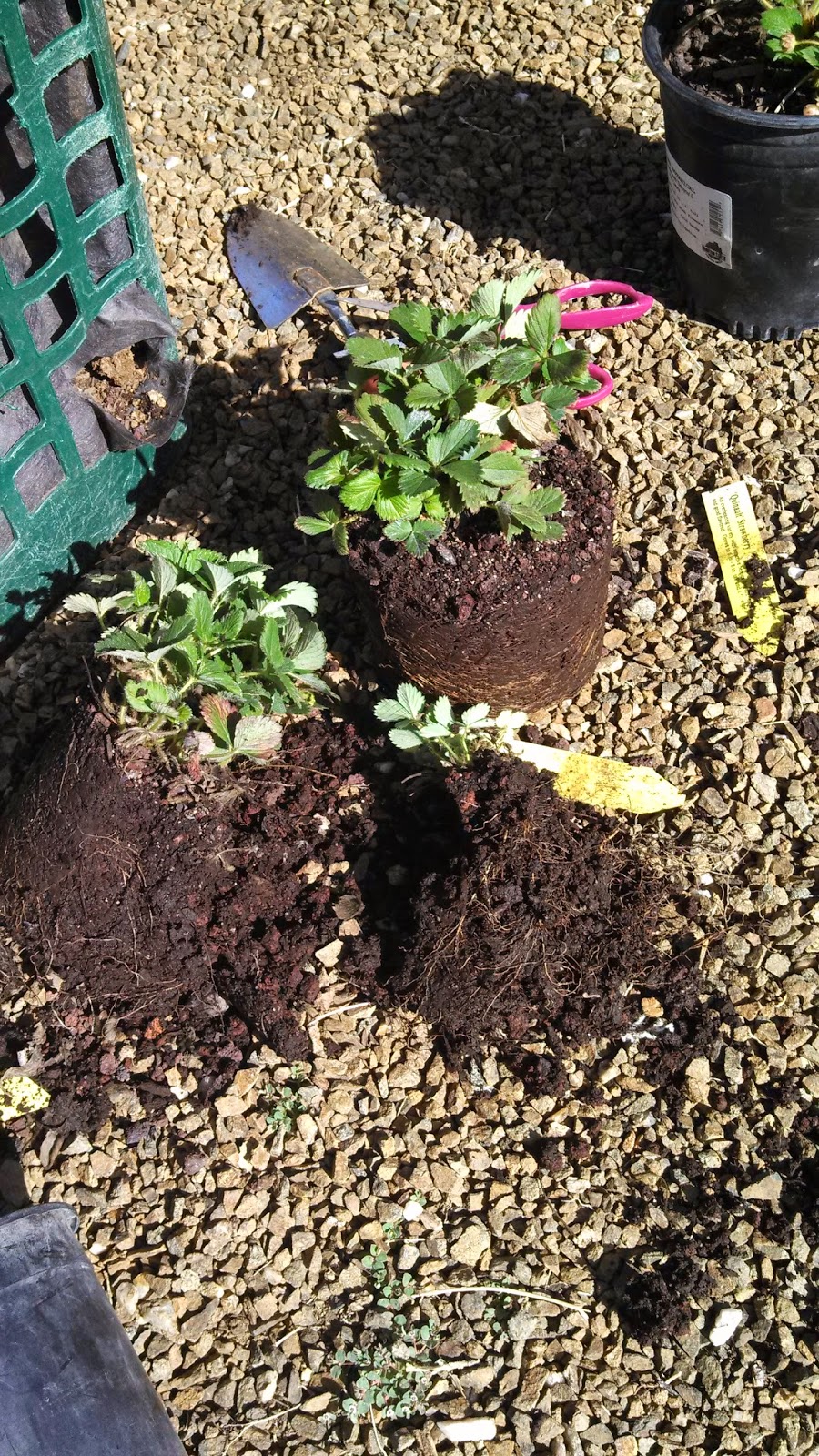 I filled it up to the base of the first holes. Then it was Strawberry time! I was Lucky and was able to get 3- 6 packs of Strawberries so I didn't have to break up the roots like with these. Forgot to Snap a pic of those! If you have the Larger Pots- you'll need to seperate the Wittle-bitty Roots...