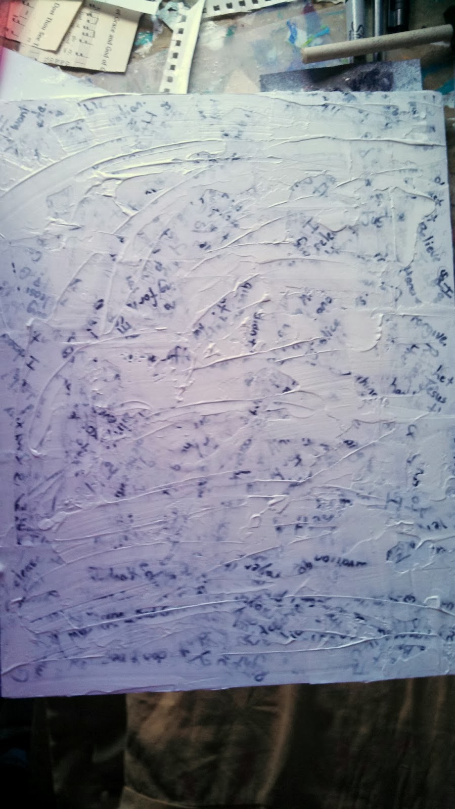 Next- it's time to take all of that Hurt and Grief and Negative Energy and cover it- But Not Completely!- with Gesso. You could also use Watered Down Acrylic Paint here. I find this part very Cathartic...it just feels good to cover it up. It's not being 'Ignored' or "Shoved Down" it has been expressed, honored and appreciated- we are just Clearing that out now to make room for more Healthy Growth and Healing.