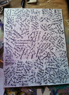 Just a quick Review- we started with 4 x 6 Index Cards- or whatever you have lying around- and a Pencil and Scribbled out all our Hurt, Anger and Pain. There were no rules here and I encourage you to be Painfully Blunt and Honest- No one is going to be able to read these on the Finished Piece so let yourself go.