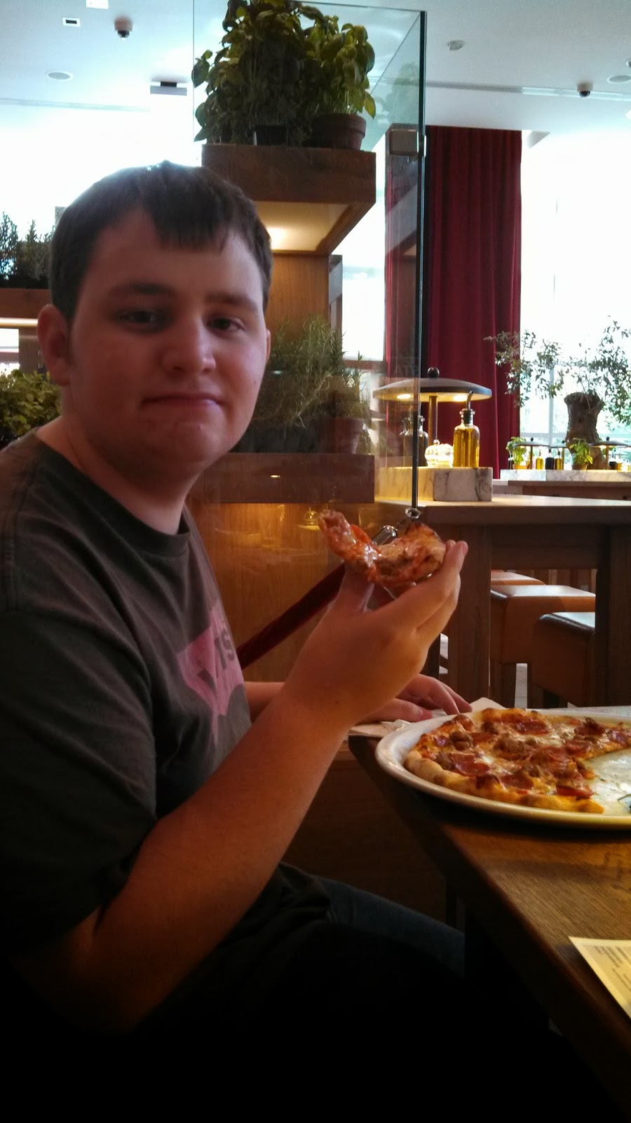 After a long day of Museum Hopping...we were back to another Fabulous Restaurant....Here Nick is eating an entire Gourmet Pepperoni and Spicy Sausage Mini Pizza...after texting a picture of it to his brother of course...:)