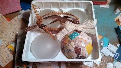 Here- I am beginning the process with Covering Half of the Bulb at a time in Mod Podge. I thought I'd just stick on a bunch of scraps and then cover them again with more Podgey Goodness.