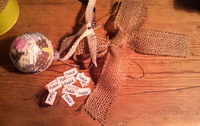 I just printed out the Word "Peace" a bunch of times and then Used a Brown Ink Pad around the edges. I just Mod Podged them on each one.